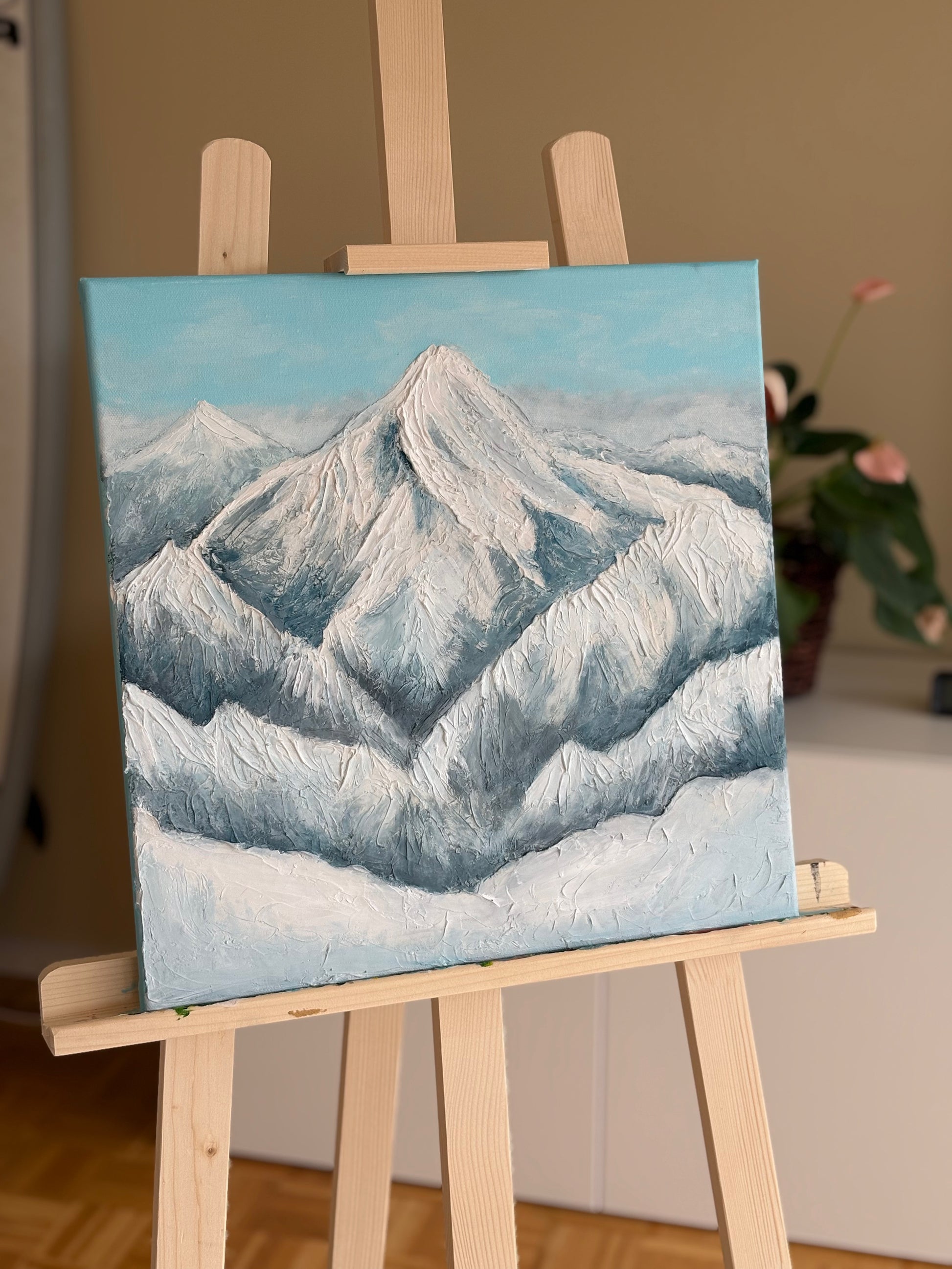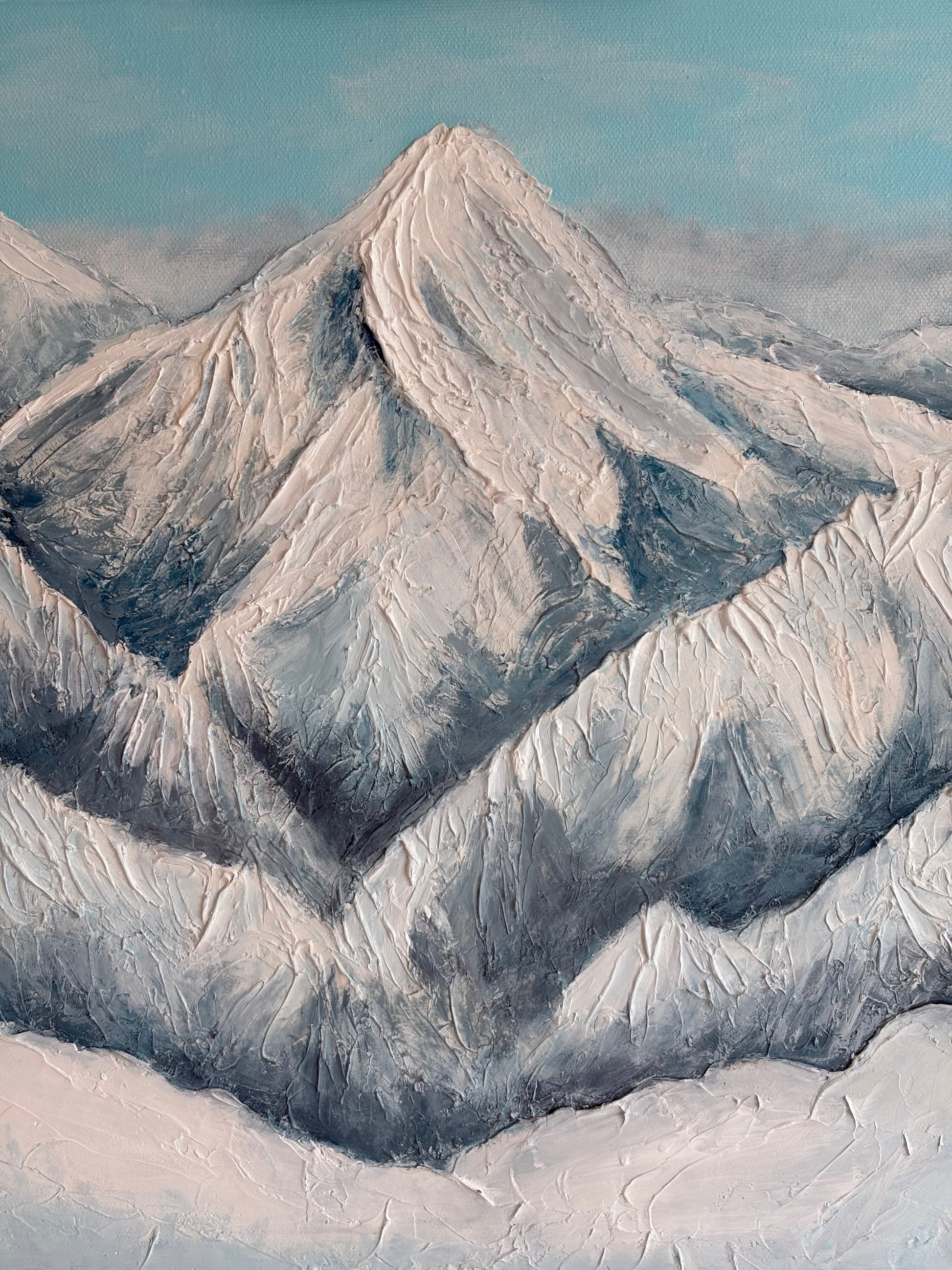 Acrylic and modeling paste on canvas, textured with layered strokes to capture the stillness and strength of alpine peaks. Unframed, but ready to hang.