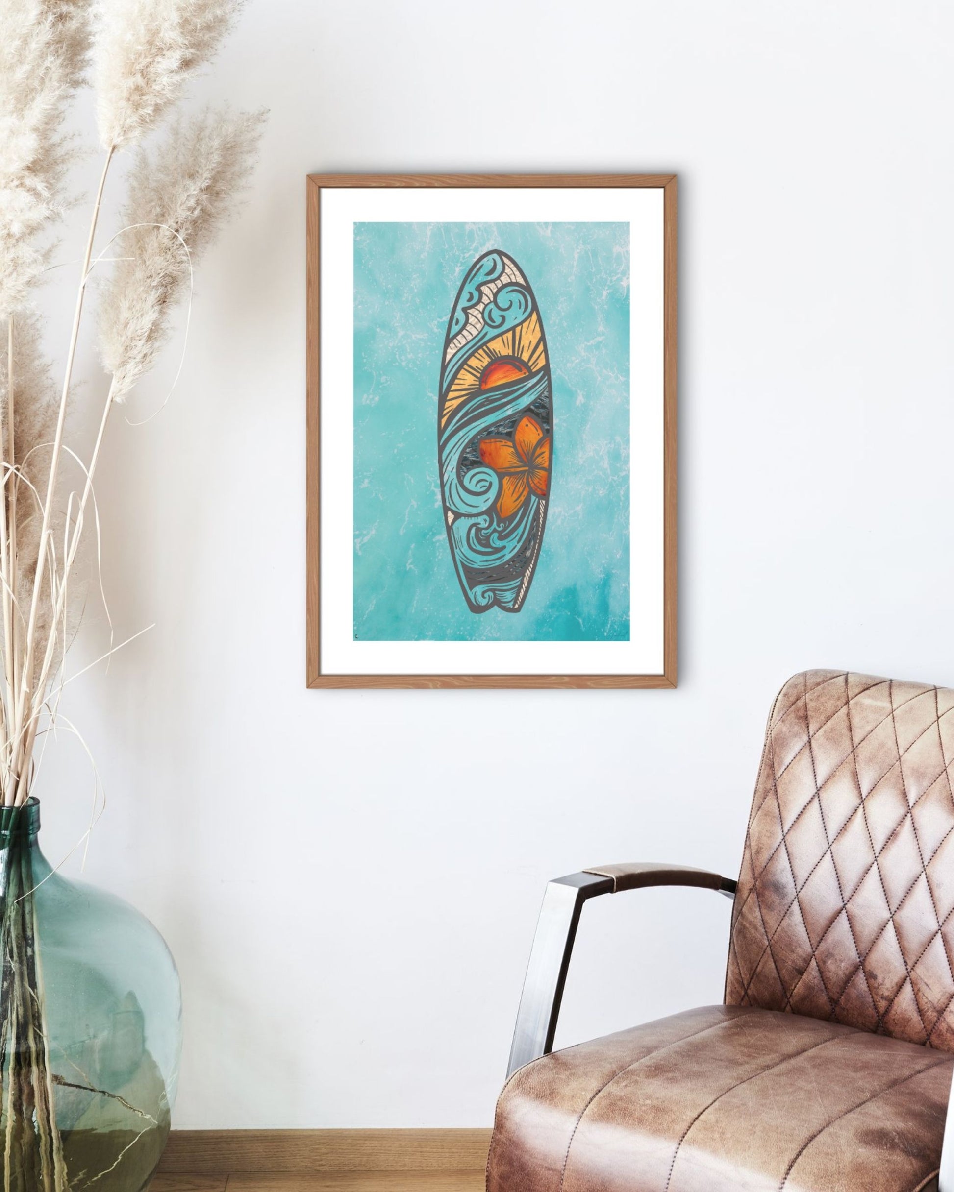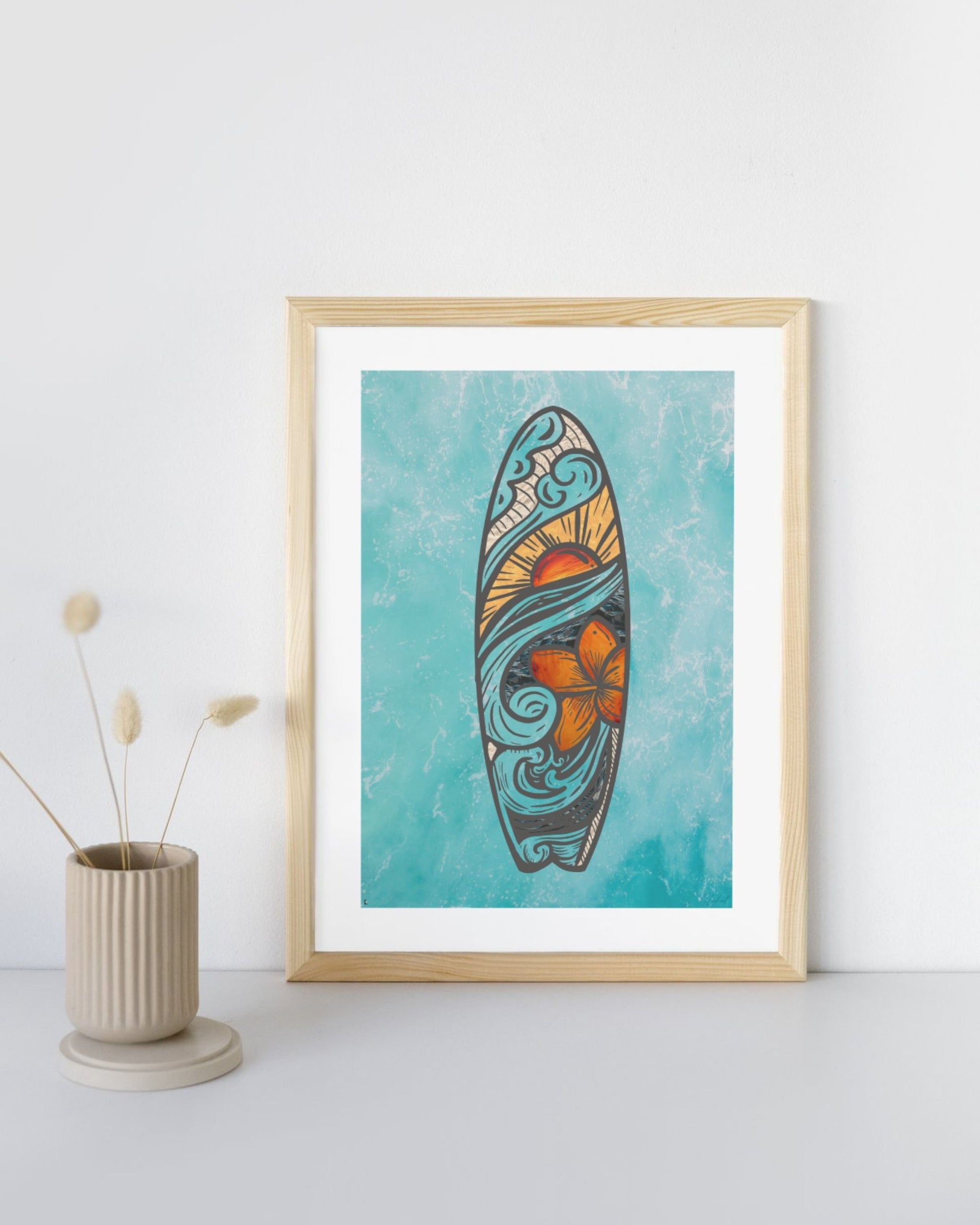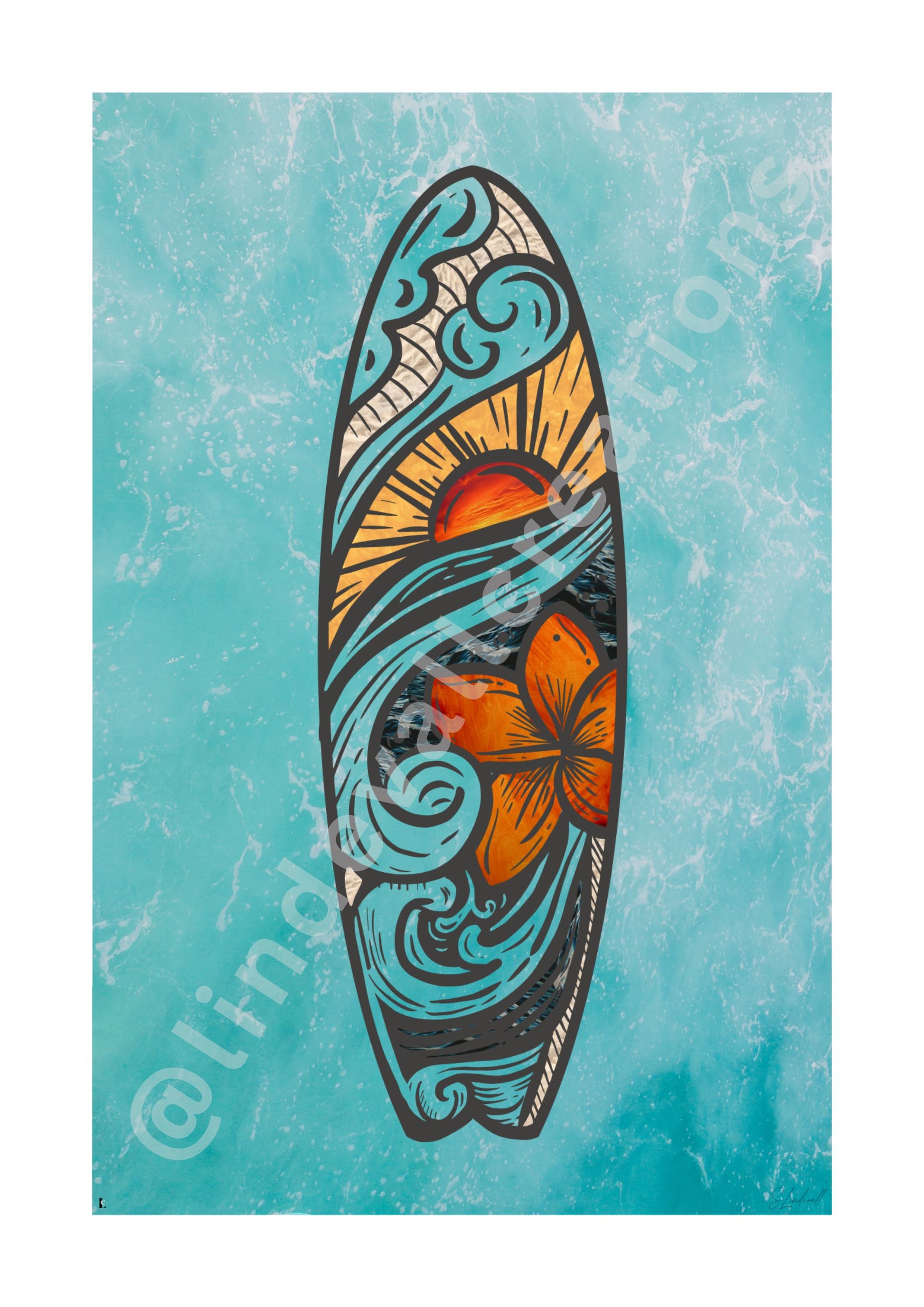 A stylized surfboard filled with waves, petals, and sun — blending natural elements into one flowing graphic form over turquoise water.
