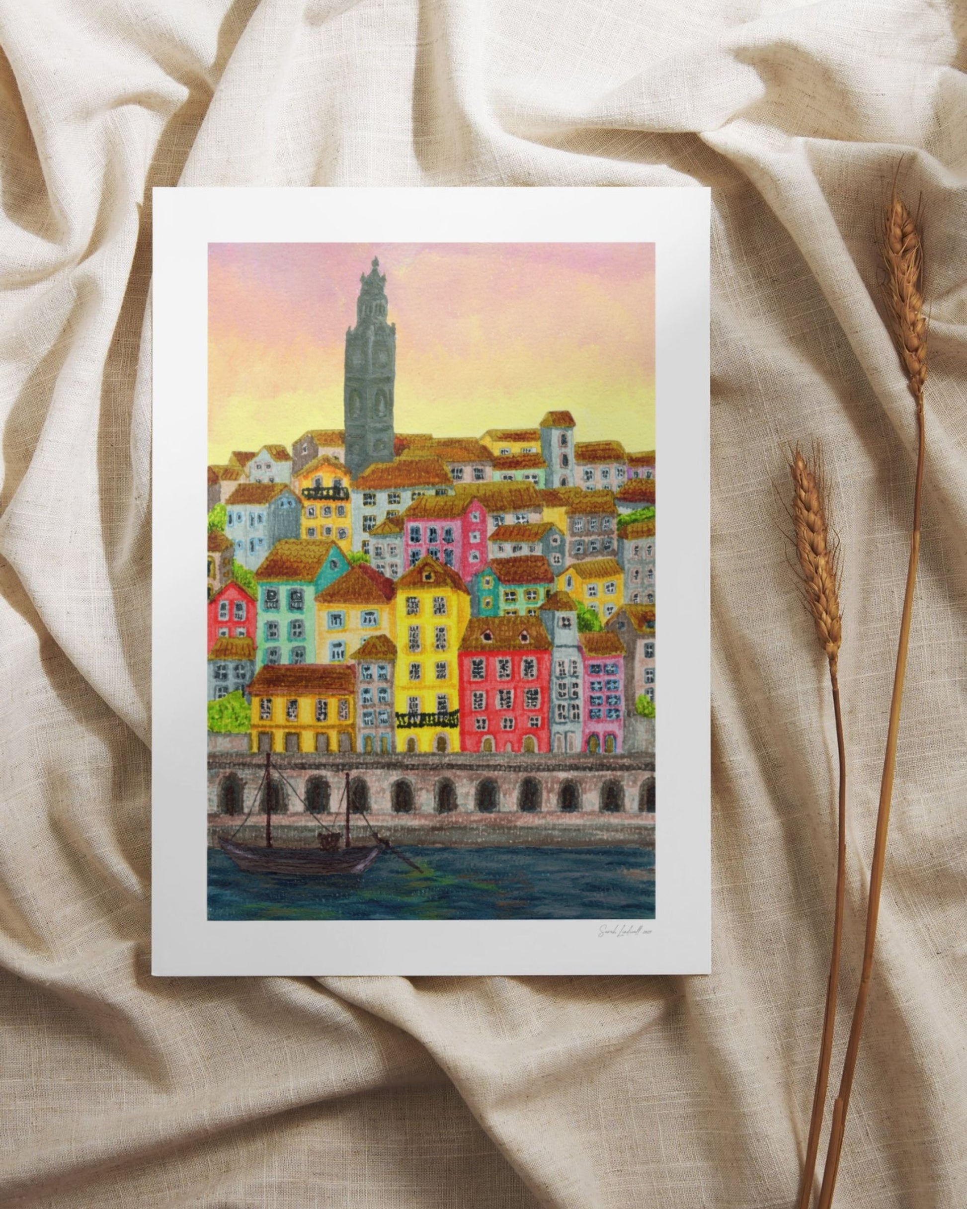 Printed on high-quality matte giclée paper to faithfully reproduce the color and detail of the original. This piece shows a pastel view of Porto’s riverside homes and historic tower, glowing under a pink and yellow sky.