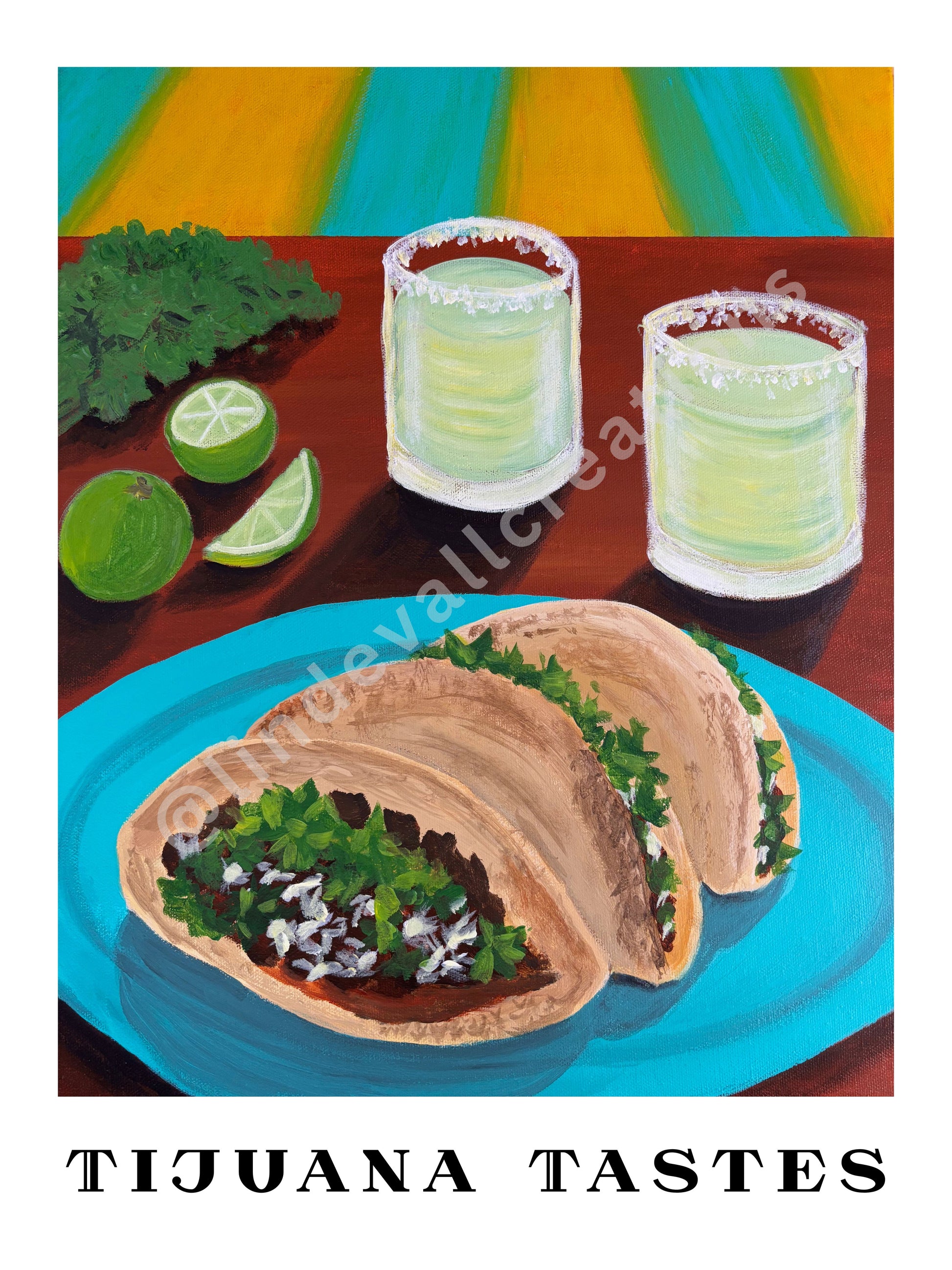Giclée print of an original acrylic painting of tacos and margaritas.